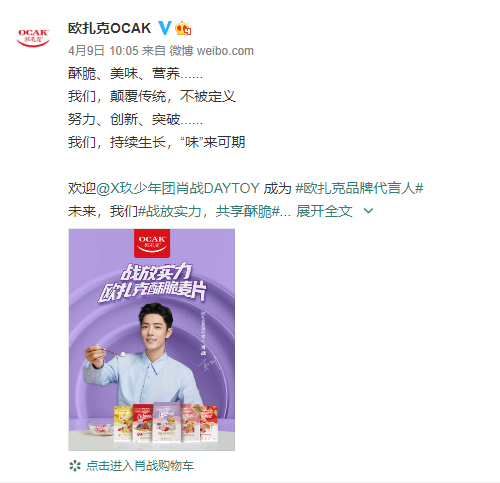 在2021年4月9日這一天,肖戰(zhàn)代言的歐扎克麥片官宣了,制作的廣告片十分精美。