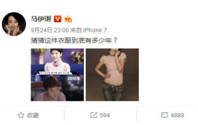 高娛傳媒明星經紀公司訊 24日晚,馬伊琍微博曬出兩張不同時期的衣服,并配文稱:猜猜這件衣服到底多少年?引來網友的一片熱論。