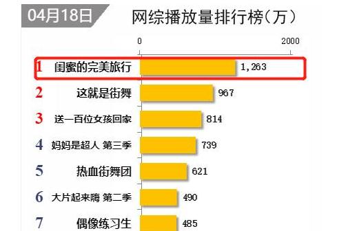 本期榜單變動很大,前十名網(wǎng)綜的排名都有著不同程度的變化,其中婁藝瀟、程瀟以及吳映潔加盟的《閨蜜的完美旅行》以1263萬的首播網(wǎng)絡(luò)播放量奪冠,易烊千璽新網(wǎng)綜《這就是街舞》以967萬播放量排第二,新網(wǎng)綜《送一百位女孩回家》是最大黑馬,以814萬播放量排第三,此外鹿晗加盟的《熱血街舞團(tuán)》排第五?!杜枷窬毩?xí)生》、《機(jī)器人爭霸》以及《這就是鐵甲》分別排在第七、第九、第十位。