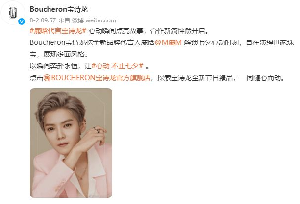 8月2日,寶詩龍官宣鹿晗成為品牌代言人,也是寶詩龍創(chuàng)立以來的全球首位男性代言人,大家都知道,頂奢品牌在選擇代言人的時(shí)候,看重的不僅僅是流量,更要考慮明星藝人的國際影響力、商業(yè)價(jià)值、形象氣質(zhì)、專業(yè)素養(yǎng)、人品道德等多方面因素。
