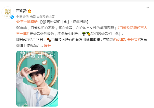 7月5日,百雀羚官方宣布由王一博擔(dān)任品牌代言人,百雀羚作為國內(nèi)經(jīng)典的草本護膚品牌,從中國制造到中國智造,百雀羚更懂國人的護膚需求、膚質(zhì)、喜好,將東方草本和現(xiàn)代科技完美融合,研發(fā)出百雀羚幀顏淡紋修護系列,以百年文化打造國貨品質(zhì),用科技新草本定幀每位東方女性的美麗容顏,鼓勵女性開懷笑無懼紋。