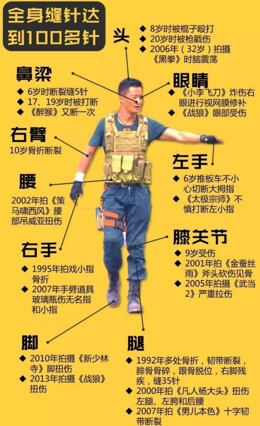 據(jù)說,吳京拍戲是從來都不用替身的,無論是多危險的戲份他都是親自上陣,對于演員來說,拍攝現(xiàn)場一般都是非常辛苦的,尤其是武打戲,受傷都是常有的情況,據(jù)吳京的粉絲統(tǒng)計,截止至今,吳京全身上下縫了100多針,頭部、眼睛、鼻梁、四肢等都曾多次受傷,吳京也曾在采訪中表示:自己不是靠臉吃飯的,而是靠命,所以受傷很正常,如果拍攝動作戲不受傷的話,那還能叫作動作戲嗎?網(wǎng)上也流傳著多張吳京受傷的圖片,各個時間段的都有,連自己婚禮的時候都是杵著拐杖。上海明星經(jīng)紀(jì)公司不得不說這樣的演員真的很讓人敬佩,沒有人可以隨隨便便成功,在羨慕別人的同時應(yīng)該問問自己能不能吃的了這樣的苦。